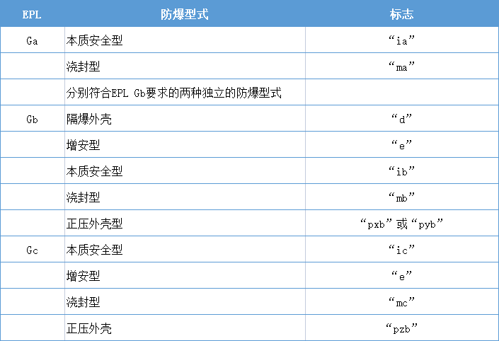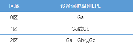 根据危险场所分类,防爆区域与适用的设备保护级别EPL关系如下: