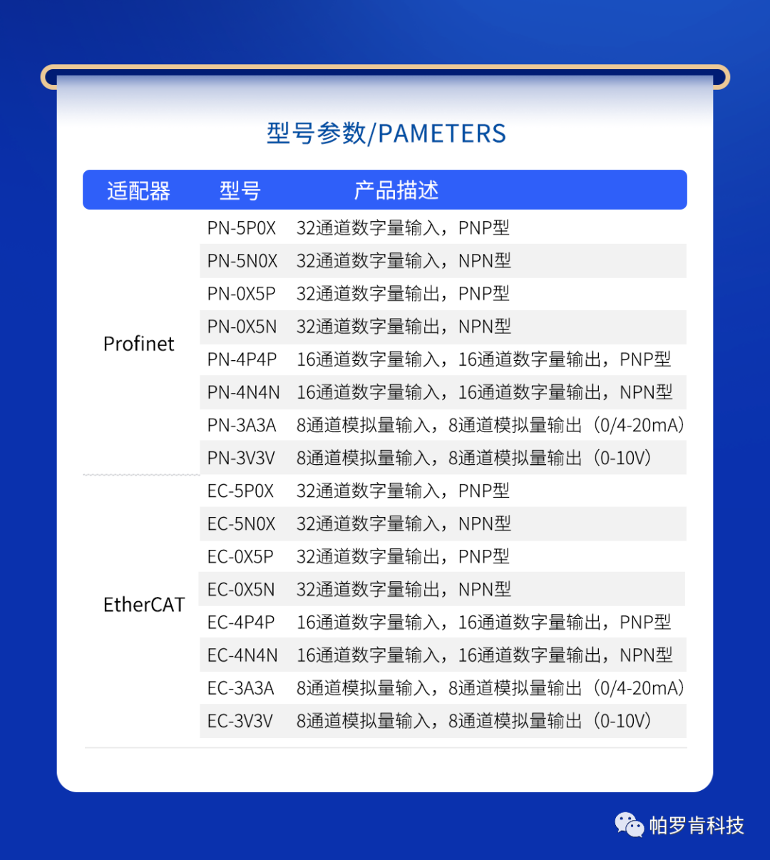 目前已成功开发以Profinet,EtherCAT,总线协议为基础的一体式I/O,具体型号如下: