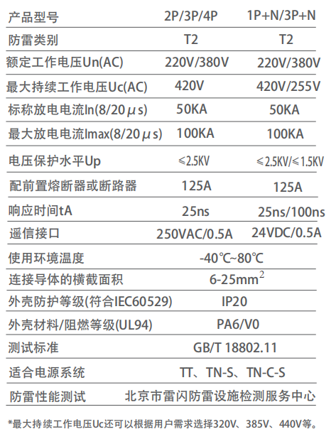 ● 安装在220V/380V低压供电系统分配电盘中,用于低压配电系统的第二级过电压保护,最大放电电流(8/20μS)可达100kA。