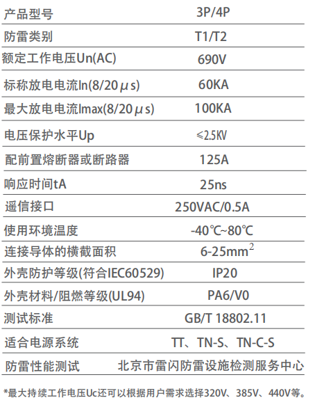 ● 采用高能压敏元件和先进防雷技术精心制作。安装在风电及光伏低压供电系统分配电盘中,用于低压配电系统的第二级过电压保护,最大放电电流(8/20μS)可达100kA。