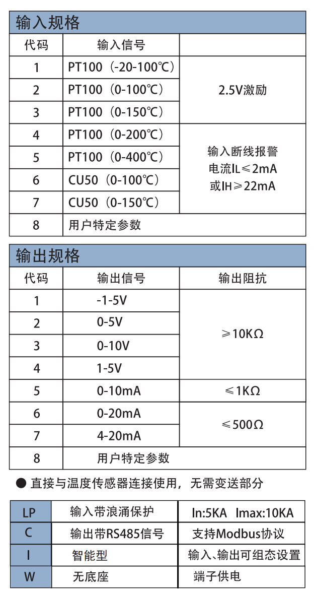 ● 带电源、报警指示,可加浪涌保护或RS485信号,输入输出量程可编程。将PT100等现场温度信号隔离、转换为标准信号或热电阻信号。